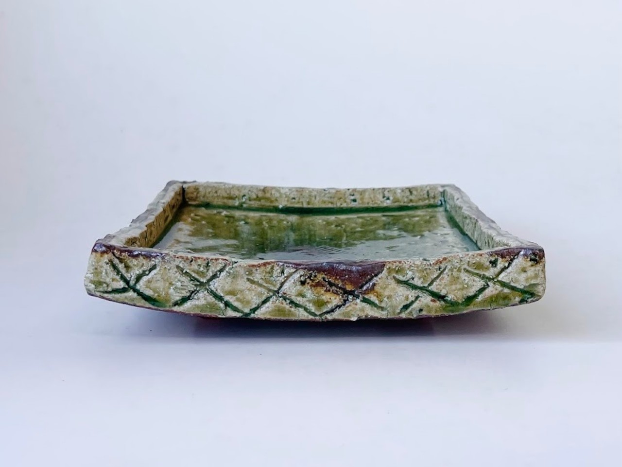 モスグリーン四つ足陶板土正角渕立皿
